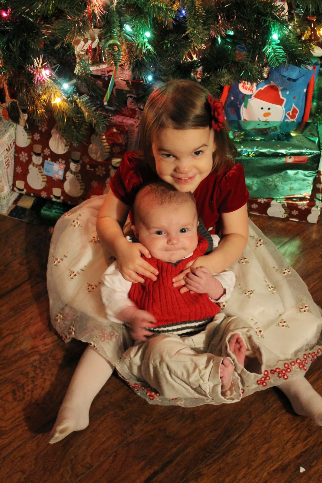 On Christmas Eve, we took a few photos with the tree after the Christmas Eve service (where everyone insisted on holding their own candle, played with the paper protector and managed to burn themselves and scream during the peaceful service, all 30 seconds apart from each other...).
